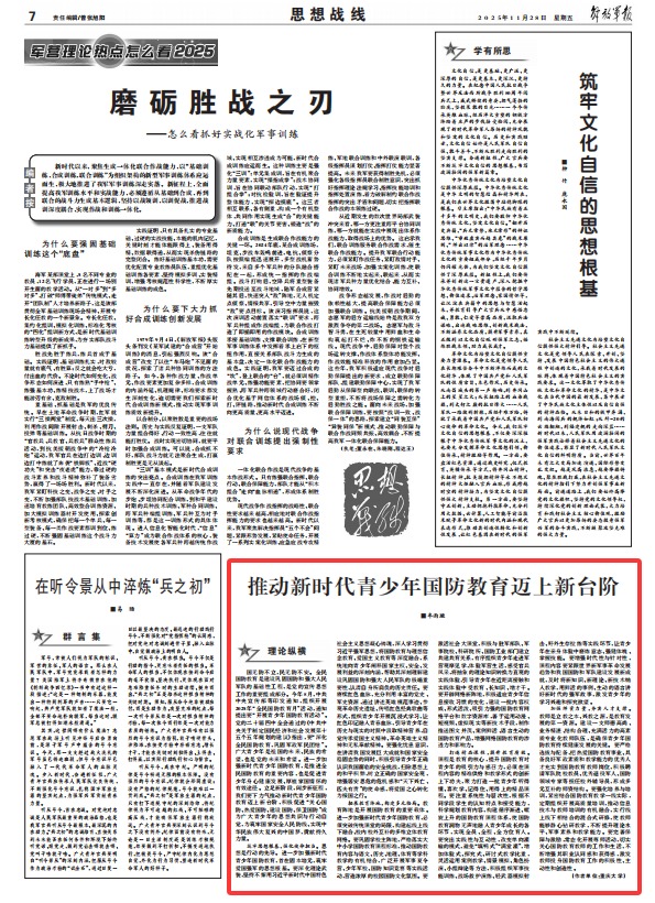 國(guó)無(wú)防不立,民無(wú)防不安。全民國(guó)防教育是建設(shè)鞏固國(guó)防和強(qiáng)大人民軍隊(duì)的基礎(chǔ)性工程,是黨的宣傳思想工作的重要組成部分。今年8月,中共中央宣傳部等印發(fā)通知,組織開(kāi)展2025年“全民國(guó)防教育月”活動(dòng),通知提出要“開(kāi)展青少年國(guó)防教育活動(dòng)”。黨的二十屆四中全會(huì)通過(guò)的《中共中央關(guān)于制定國(guó)民經(jīng)濟(jì)和社會(huì)發(fā)展第十五個(gè)五年規(guī)劃的建議》指出,要“深化全民國(guó)防教育,鞏固軍政軍民團(tuán)結(jié)”。廣大青少年是祖國(guó)的未來(lái)、民族的希望,也是黨的未來(lái)和希望。進(jìn)一步加強(qiáng)新時(shí)代青少年國(guó)防教育,是推進(jìn)全民國(guó)防教育的重要內(nèi)容,也是促進(jìn)青少年身心健康發(fā)展、厚植家國(guó)情懷的有效途徑。立足新階段,闊步新征程,我們要下力氣推動(dòng)新時(shí)代青少年國(guó)防教育邁上新臺(tái)階,積極促進(jìn)“關(guān)心國(guó)防、熱愛(ài)國(guó)防、建設(shè)國(guó)防、保衛(wèi)國(guó)防”成為廣大青少年的思想共識(shí)與行動(dòng)自覺(jué),為筑牢國(guó)家安全人民防線、實(shí)現(xiàn)中華民族偉大復(fù)興的中國(guó)夢(mèng),貢獻(xiàn)持久力量。