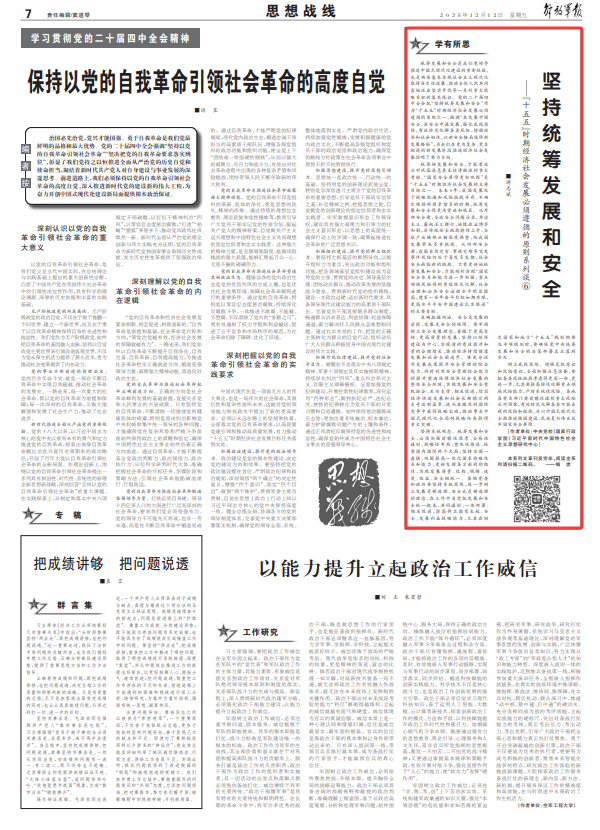 統(tǒng)籌發(fā)展和安全是我們黨領導推進中國式現代化建設的重要經驗,也是確保基本實現社會主義現代化取得決定性進展、推動全體人民共同富裕邁出堅實步伐等一系列重大戰(zhàn)略目標的基本保證。黨的二十屆四中全會把“堅持統(tǒng)籌發(fā)展和安全”作為“十五五”時期經濟社會發(fā)展必須遵循的原則之一,強調“在發(fā)展中固安全,在安全中謀發(fā)展,強化底線思維,有效防范化解各類風險,增強經濟和社會韌性,以新安全格局保障新發(fā)展格局”,為我們在更為復雜、更具挑戰(zhàn)的新發(fā)展階段推進經濟社會發(fā)展指明了努力方向。