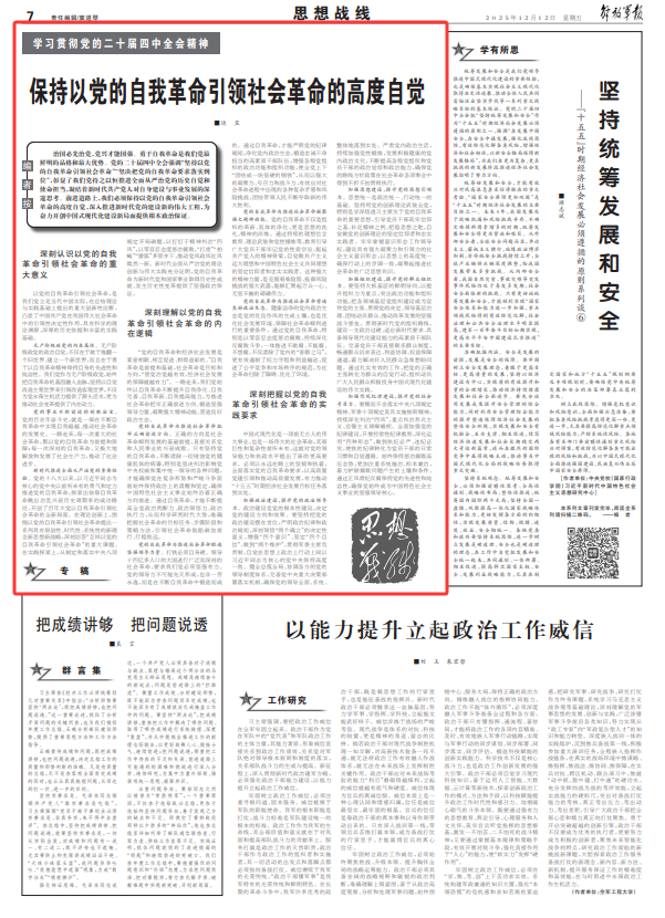 加強(qiáng)思想建設(shè),提升黨的思想引領(lǐng)力。思想統(tǒng)一是政治統(tǒng)一、行動(dòng)統(tǒng)一的基礎(chǔ)。堅(jiān)持用黨的創(chuàng)新理論武裝全黨,特別是學(xué)深悟透習(xí)主席關(guān)于黨的自我革命的重要思想,引導(dǎo)黨員干部筑牢信仰之基、補(bǔ)足精神之鈣、把穩(wěn)思想之舵,自覺做黨的創(chuàng)新理論的堅(jiān)定信仰者和忠實(shí)實(shí)踐者。牢牢掌握意識(shí)形態(tài)工作領(lǐng)導(dǎo)權(quán),建設(shè)具有強(qiáng)大凝聚力和引領(lǐng)力的社會(huì)主義意識(shí)形態(tài),以思想上的高度統(tǒng)一確保行動(dòng)上的步調(diào)一致,凝聚起推進(jìn)社會(huì)革命的廣泛思想共識(shí)。