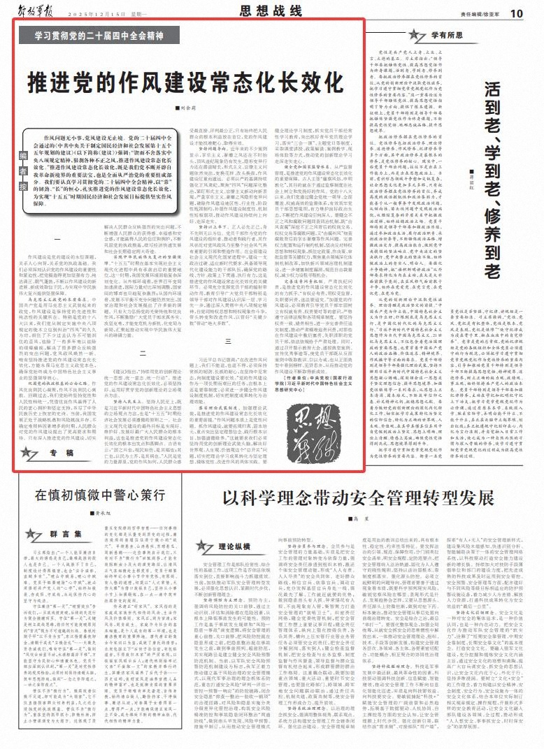 作風問題無小事,黨風建設(shè)無止境。黨的二十屆四中全會通過的《中共中央關(guān)于制定國民經(jīng)濟和社會發(fā)展第十五個五年規(guī)劃的建議》(以下簡稱《建議》)強調(diào):“鍥而不舍落實中央八項規(guī)定精神,狠剎各種不正之風,推進作風建設(shè)常態(tài)化長效化?!蓖七M作風建設(shè)常態(tài)化長效化,既是我們黨不斷開辟自我革命新境界的重要法寶,也是全面從嚴治黨的重要組成部分。我們要認真學(xué)習貫徹黨的二十屆四中全會精神,以“?!钡捻g勁、“長”的恒心,扎實推進黨的作風建設(shè)常態(tài)化長效化,為實現(xiàn)“十五五”時期國民經(jīng)濟和社會發(fā)展目標提供堅實作風保障。