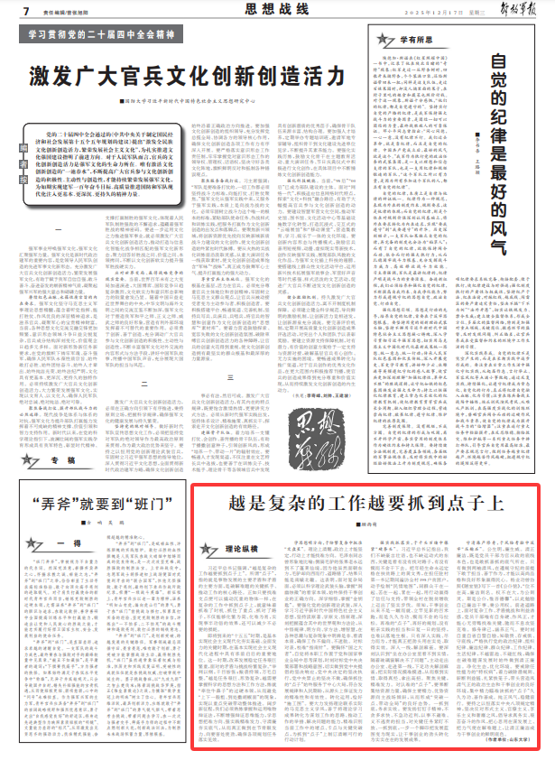 學(xué)思想明方向,于紛繁復(fù)雜中把準(zhǔn)“定盤星”。理論上清醒,政治上才能堅(jiān)定,行動(dòng)上才能找準(zhǔn)方向。毛澤東同志曾形象地比喻:倒騎毛驢的張果老永遠(yuǎn)到不了蓬萊仙境,因?yàn)樗m然面朝東方,毛驢卻向西而行,道路錯(cuò)了,結(jié)果只能是南轅北轍。這表明,面對(duì)復(fù)雜局面,必須以科學(xué)理論武裝頭腦,掌握“洞幽燭微”的看家本領(lǐng),始終保持干事創(chuàng)業(yè)的正確方向。深學(xué)細(xì)悟,掌握“金鑰匙”。要強(qiáng)化黨的創(chuàng)新理論武裝,深入學(xué)習(xí)習(xí)近平新時(shí)代中國(guó)特色社會(huì)主義思想,堅(jiān)持讀原著、學(xué)原文、悟原理,深刻把握蘊(yùn)含其中的世界觀和方法論,從中悟規(guī)律、明方向、學(xué)方法、增智慧,在各種思潮與復(fù)雜現(xiàn)象中明辨是非、看清本質(zhì),確保工作不偏向、不迷航。對(duì)標(biāo)對(duì)表,校準(zhǔn)“指南針”。要胸懷“國(guó)之大者”,自覺(jué)將本職工作置于黨和國(guó)家事業(yè)全局中思考謀劃,時(shí)刻對(duì)標(biāo)黨中央決策部署和戰(zhàn)略意圖,切實(shí)做到黨中央提倡的堅(jiān)決響應(yīng),黨中央決定的堅(jiān)決執(zhí)行,黨中央禁止的堅(jiān)決不做,確保抓住的“點(diǎn)子”始終服務(wù)于中心大局,符合發(fā)展規(guī)律和人民期盼,從源頭上保證發(fā)力的精準(zhǔn)性和有效性。轉(zhuǎn)化運(yùn)用,繪好“施工圖”。要大力發(fā)揚(yáng)理論聯(lián)系實(shí)際的馬克思主義學(xué)風(fēng),善于將理論學(xué)習(xí)成果轉(zhuǎn)化為謀劃工作的思路、推動(dòng)工作的舉措、解決問(wèn)題的能力,精準(zhǔn)識(shí)別當(dāng)前工作中的堵點(diǎn)、卡點(diǎn)與關(guān)鍵突破點(diǎn),為抓到“點(diǎn)子”上制訂清晰可行的行動(dòng)計(jì)劃。