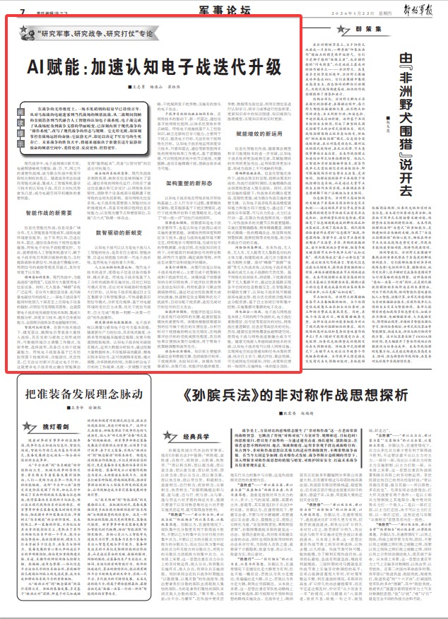 信息化智能化作戰(zhàn),隨著算法模型和學習推理技術的進一步突破,認知電子戰(zhàn)系統(tǒng)將更加成熟完善,其賦能增效的作用將更加突出,運用場景將更加豐富,將成為戰(zhàn)場上不可或缺的利器。
