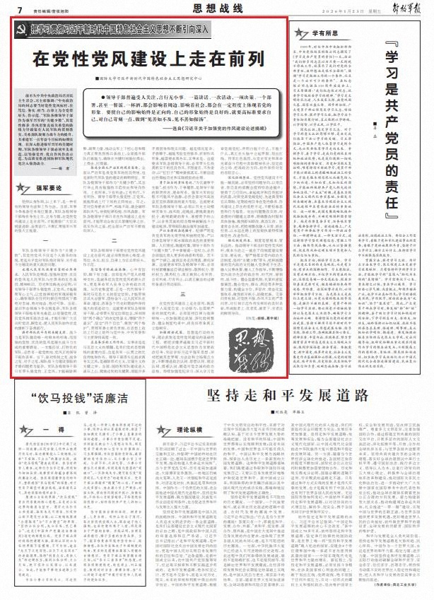 永葆人民軍隊(duì)性質(zhì)宗旨的必然要求。人民軍隊(duì)黨締造,堅(jiān)強(qiáng)的黨性、優(yōu)良的黨風(fēng)是人民軍隊(duì)與生俱來(lái)的紅色基因、精神標(biāo)識(shí)。歷史和實(shí)踐充分證明,只有領(lǐng)導(dǎo)干部帶頭強(qiáng)黨性、正黨風(fēng),才能凝聚軍心士氣,讓黨指揮槍的軍魂深植軍心,確保部隊(duì)在任何時(shí)候任何情況下都絕對(duì)忠誠(chéng)、絕對(duì)純潔、絕對(duì)可靠。當(dāng)前,意識(shí)形態(tài)領(lǐng)域斗爭(zhēng)尖銳復(fù)雜,軍隊(duì)各級(jí)領(lǐng)導(dǎo)干部唯有率先垂范,以堅(jiān)強(qiáng)黨性、優(yōu)良黨風(fēng)鑄牢政治忠誠(chéng),才能引領(lǐng)廣大官兵聽(tīng)黨話、跟黨走,使人民軍隊(duì)始終在黨的旗幟下奮勇前行。