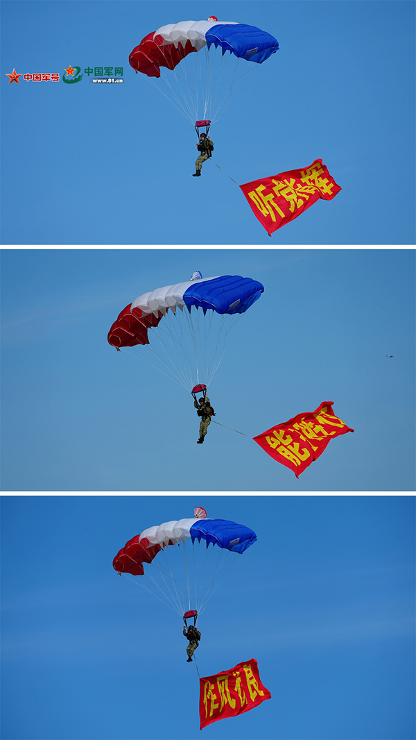 大合唱結束,2架運-12D先后騰空而起,“八一”“藍鷹”跳傘隊攜帶黨旗、國旗、八一軍旗和空軍軍旗先后躍出機艙,隨后多名跳傘員在高空依次打開橫幅、標語,表達空軍官兵矢志一流、攻堅奮進的堅強決心。