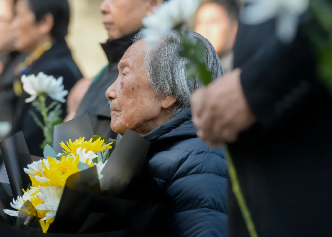 11月30日,那場浩劫的幸存者——已經(jīng)96歲的夏淑琴再次來到侵華日軍南京大屠殺遇難同胞紀(jì)念館,她很快找到“哭墻”上親人的名字,在家人的攙扶下獻上菊花,女兒和曾外孫則用黑筆替她為親人的名字“描新”。