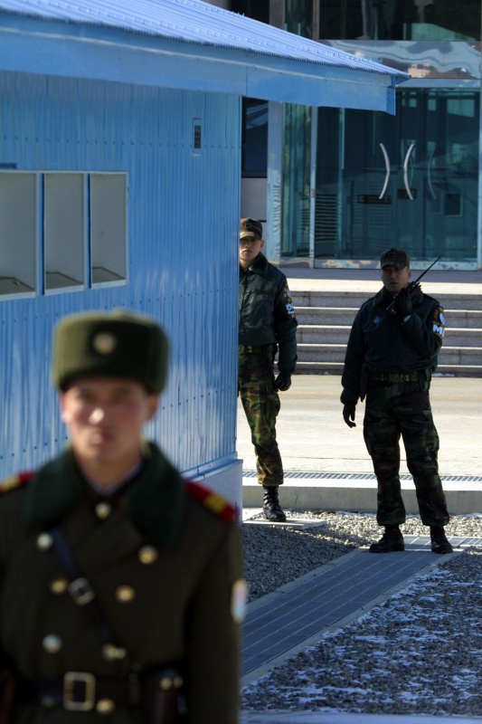 2003年2月6日拍攝的資料照片顯示,一名朝鮮人民軍士兵(前)和兩名韓國憲兵(后)分列在板門店軍事分界線兩側。新華社記者 宮一棟 攝
