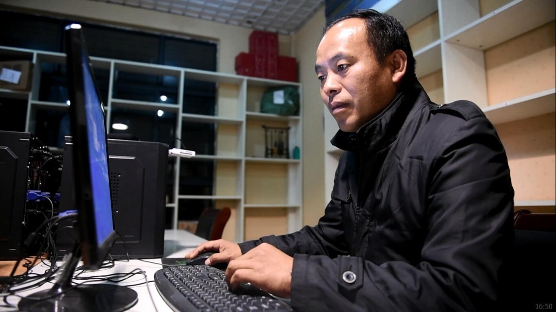 2017年11月28日,“大包干”帶頭人嚴(yán)宏昌的兒子嚴(yán)余山在自家經(jīng)營(yíng)的超市里上網(wǎng)。新華社記者 張端 攝