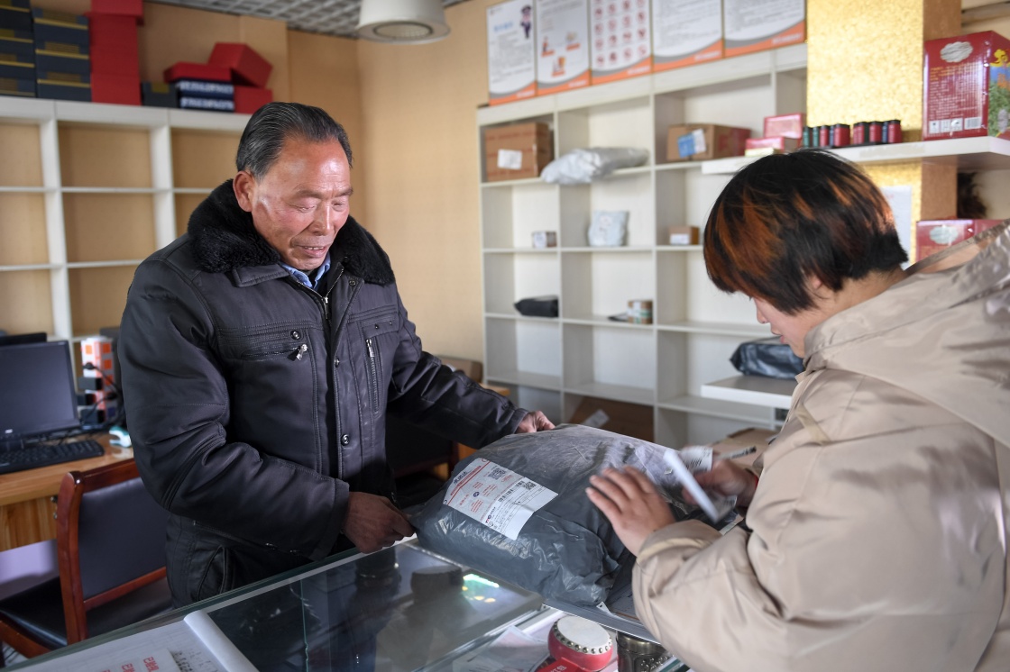 2月8日,在安徽鳳陽(yáng)小崗村,村民在“大包干”帶頭人嚴(yán)宏昌(左)的店里取快遞。這些年,“大包干”帶頭人嚴(yán)宏昌和家人做起了農(nóng)村電商。新華社記者 張端 攝