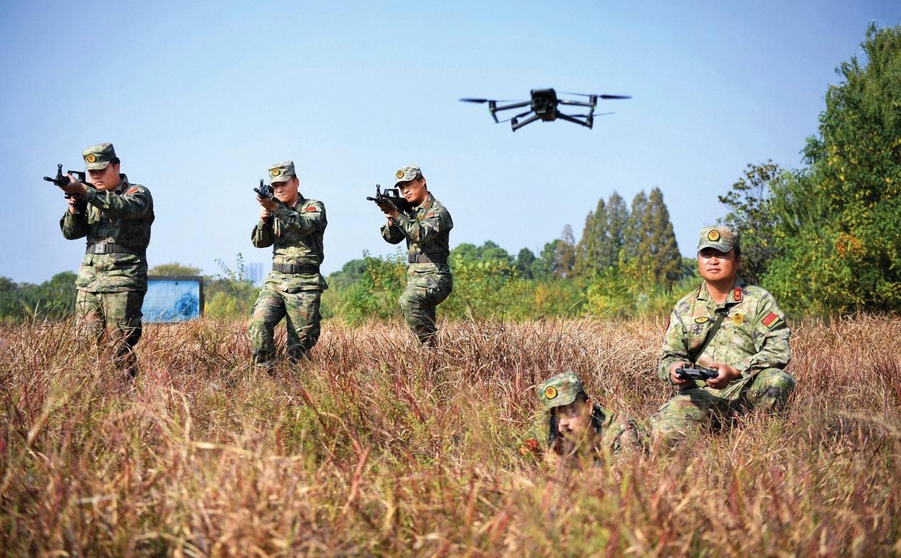 安徽省合肥市蜀山區(qū)民兵無人機(jī)分隊(duì)組織民兵進(jìn)行戰(zhàn)術(shù)訓(xùn)練。(攝影/張子博)
