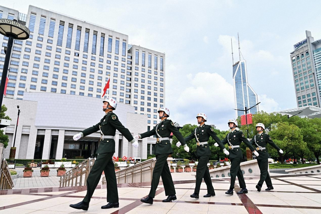 上海警備區(qū)警備糾察隊一中隊糾察小分隊正在上海人民廣場巡邏執(zhí)勤。