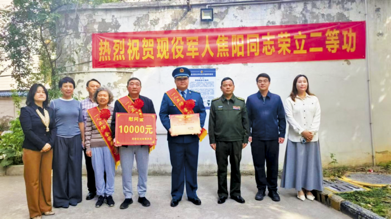 “咚咚鏘,咚咚鏘……”前不久,樊城區(qū)紫貞街道長虹盛景小區(qū)鑼鼓喧天、熱鬧非凡,軍地工作人員聯(lián)合將二等功喜報(bào)及慰問金送到現(xiàn)役軍人焦陽的家中,胸戴大紅花、身披紅綬帶的焦陽家人臉上洋溢著喜悅和自豪。