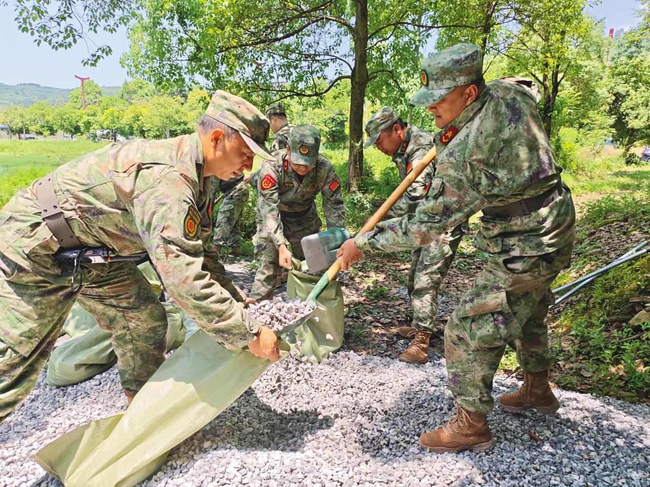 尹博(左一)正在組織民兵進行防汛演練。