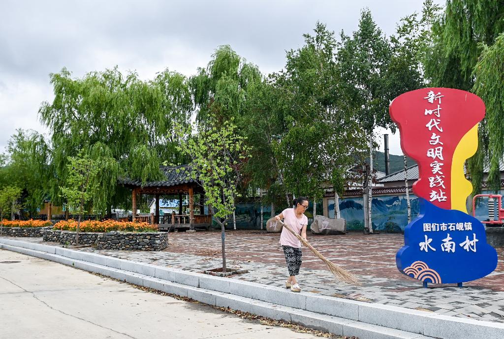 圖們市石峴鎮(zhèn)水南村村民在村子里的小廣場(chǎng)上打掃衛(wèi)生。(2021年8月3日)。新華社記者顏麟蘊(yùn)攝