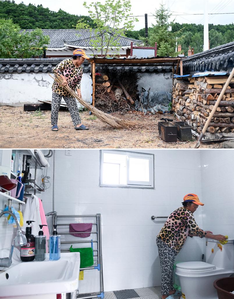 上圖為圖們市石峴鎮(zhèn)水南村村民康順姬在打掃院子里的旱廁舊址;下圖為康順姬打掃室內(nèi)水沖廁所(2021年8月3日攝)。新華社記者顏麟蘊(yùn)攝