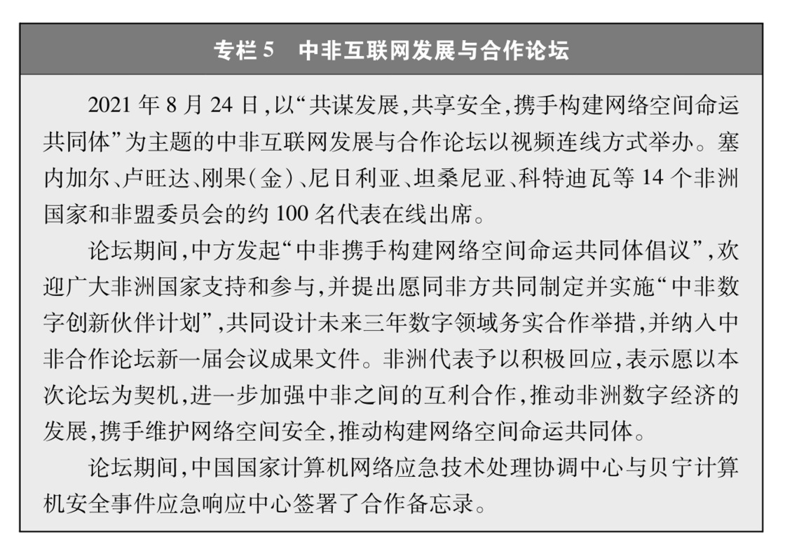 加強(qiáng)與周邊和廣大發(fā)展中國(guó)家網(wǎng)信合作。中國(guó)-東盟信息港論壇連續(xù)成功舉辦,持續(xù)推動(dòng)中國(guó)與東盟國(guó)家數(shù)字領(lǐng)域合作,建立中國(guó)-東盟網(wǎng)絡(luò)事務(wù)對(duì)話機(jī)制。建立中日韓三方網(wǎng)絡(luò)磋商機(jī)制。與韓國(guó)聯(lián)合主辦中韓互聯(lián)網(wǎng)圓桌會(huì)議。舉辦中非互聯(lián)網(wǎng)發(fā)展與合作論壇,發(fā)布“中非攜手構(gòu)建網(wǎng)絡(luò)空間命運(yùn)共同體倡議”,提出了“中非數(shù)字創(chuàng)新伙伴計(jì)劃”。中國(guó)-南非新媒體圓桌會(huì)議、中坦(坦桑尼亞)網(wǎng)絡(luò)文化交流會(huì)、中肯(肯尼亞)數(shù)字經(jīng)濟(jì)合作發(fā)展研討會(huì)等活動(dòng)加強(qiáng)了中非在新媒體、網(wǎng)絡(luò)文化、數(shù)字經(jīng)濟(jì)等領(lǐng)域交流合作。舉辦多屆網(wǎng)上絲綢之路大會(huì),在信息基礎(chǔ)設(shè)施、跨境電子商務(wù)、智慧城市等領(lǐng)域與阿拉伯國(guó)家開展務(wù)實(shí)合作。舉辦中古(古巴)互聯(lián)網(wǎng)圓桌論壇、中巴(巴西)互聯(lián)網(wǎng)治理研討會(huì),圍繞信息時(shí)代互聯(lián)網(wǎng)的發(fā)展與治理開展對(duì)話交流。與亞非國(guó)家開展網(wǎng)絡(luò)法治對(duì)話。2015年4月,亞洲-非洲法律協(xié)商組織(“亞非法協(xié)”)第54屆年會(huì)在北京舉行。在中方建議下,“亞非法協(xié)”決定設(shè)立“網(wǎng)絡(luò)空間國(guó)際法工作組”。工作組圍繞相關(guān)議題深入開展討論。