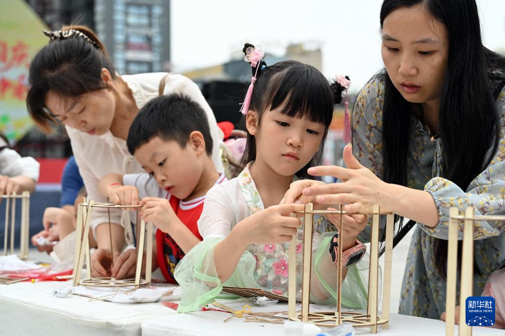 10月6日,在四川省內(nèi)江市東興區(qū)西林街道,孩子們和家人一起制作中秋燈籠。新華社發(fā)(唐明潤攝)