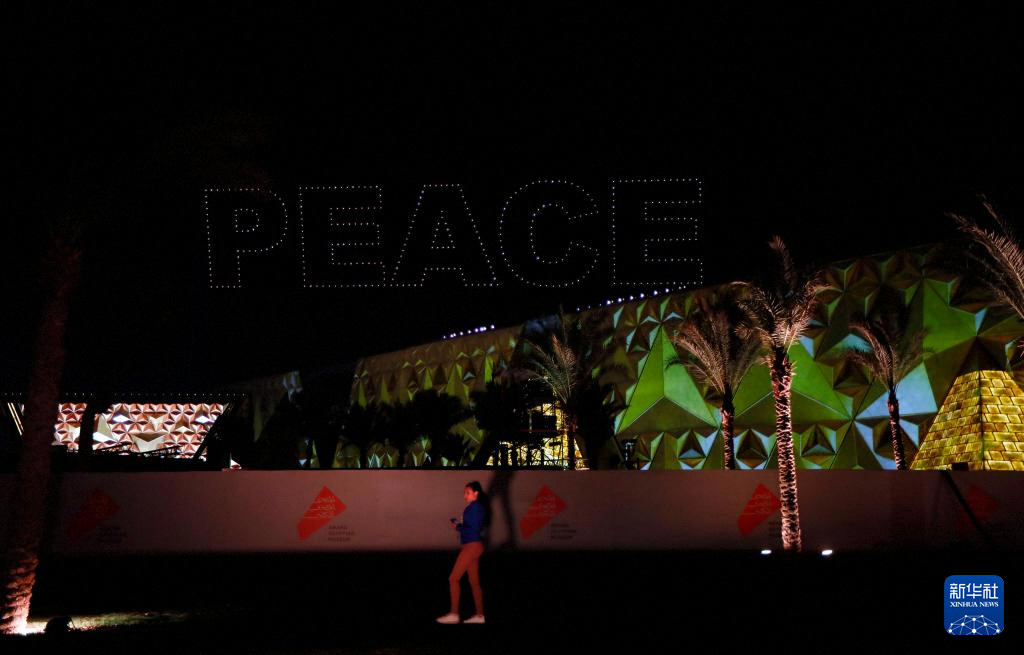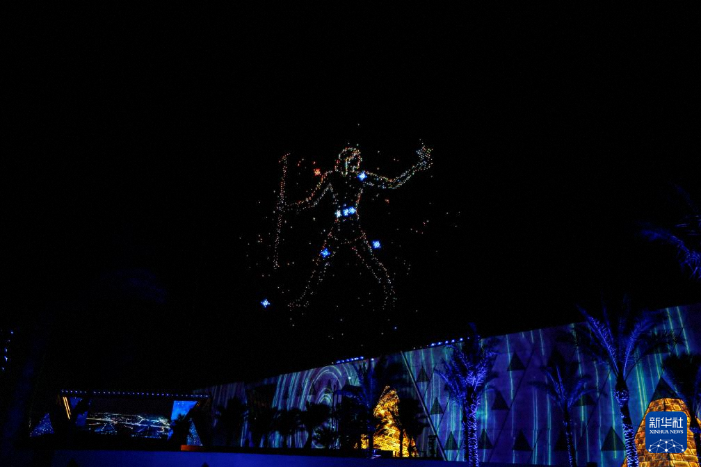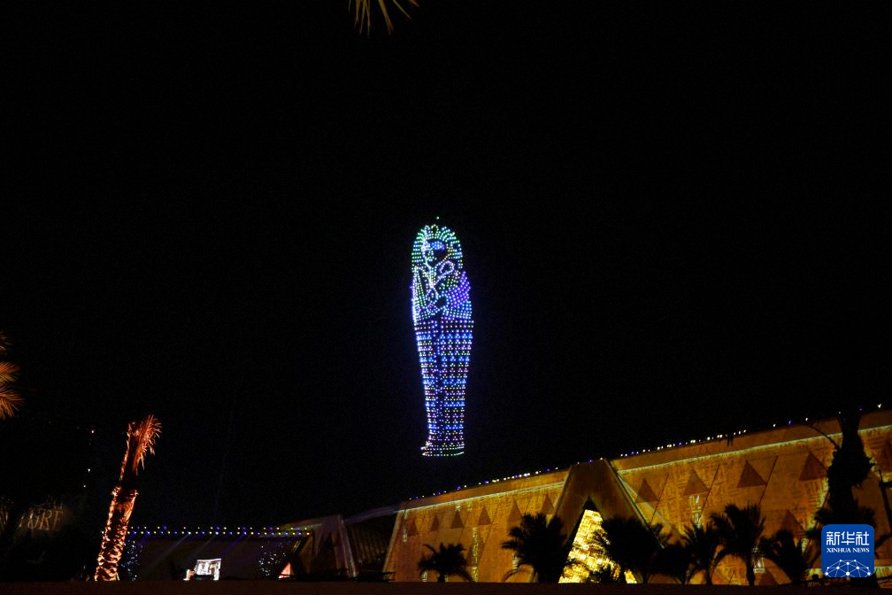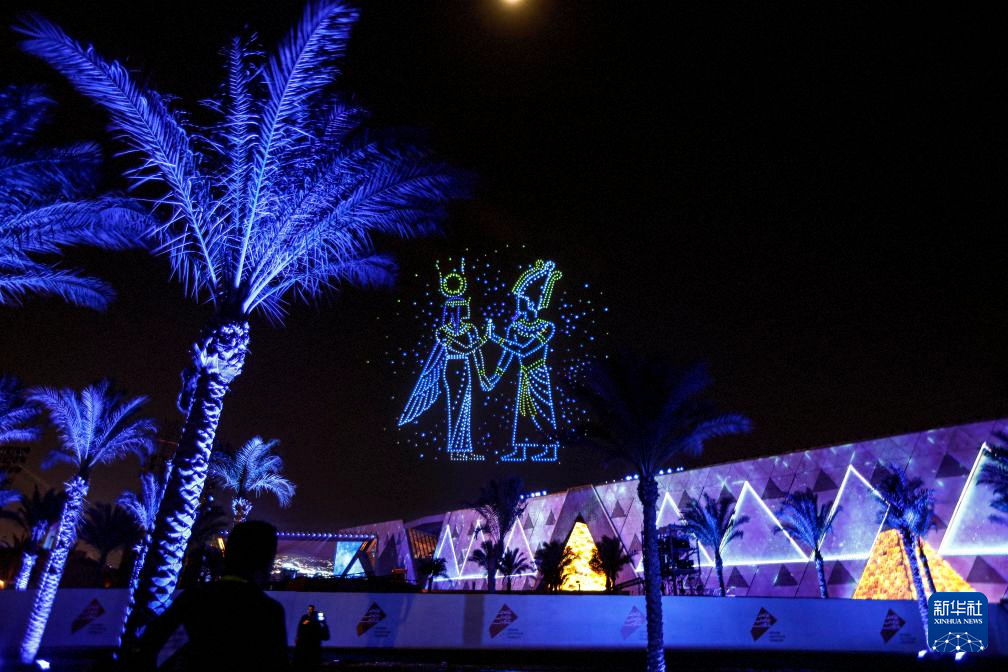 這是11月1日在埃及吉薩拍攝的開館儀式上的無(wú)人機(jī)表演和燈光秀。新華社發(fā)(艾哈邁德·戈馬攝)
