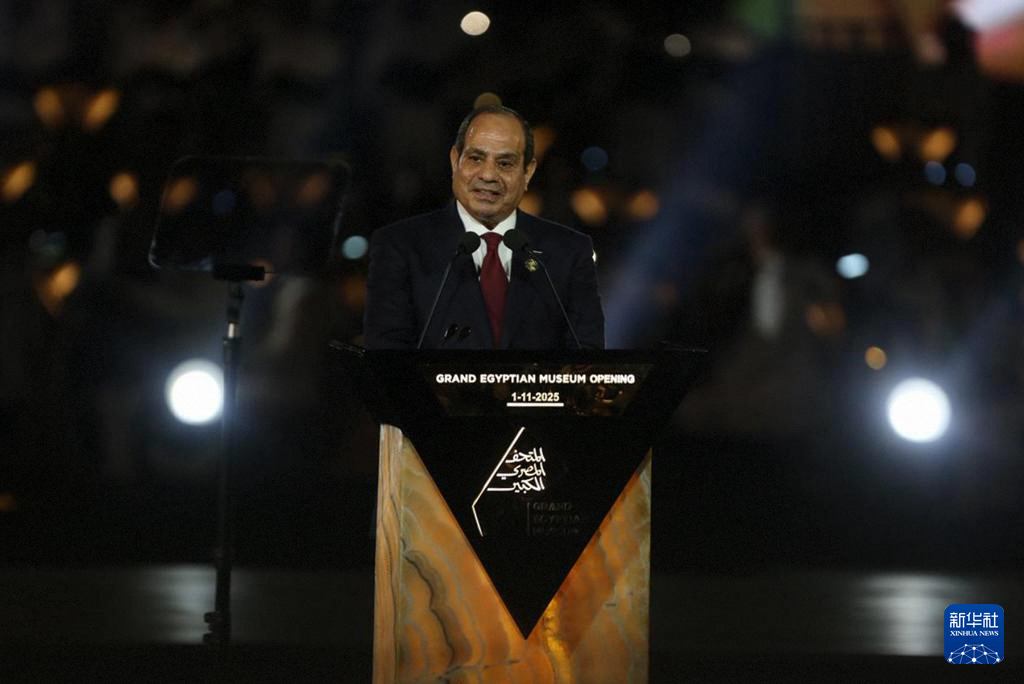11月1日,在埃及吉薩,埃及總統(tǒng)塞西在開館儀式上致辭。世界最大單一文明博物館——大埃及博物館11月1日正式開館。數(shù)十個(gè)由各國(guó)元首、政府首腦、地區(qū)和國(guó)際組織負(fù)責(zé)人率領(lǐng)的官方代表團(tuán)參加了當(dāng)晚舉行的開館儀式。?新華社發(fā)
