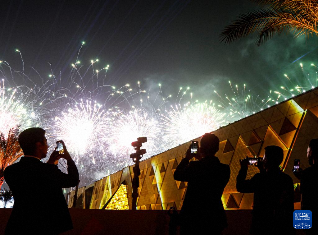 11月1日,人們?cè)诎<凹_舉行的開館儀式上拍攝煙花和燈光秀表演。新華社發(fā)(艾哈邁德·戈馬攝)