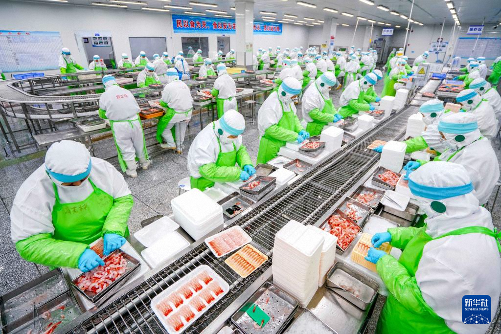 11月10日,山東日照美佳集團的工作人員將甜蝦產品裝盤。新華社發(fā)(王敬之 攝)