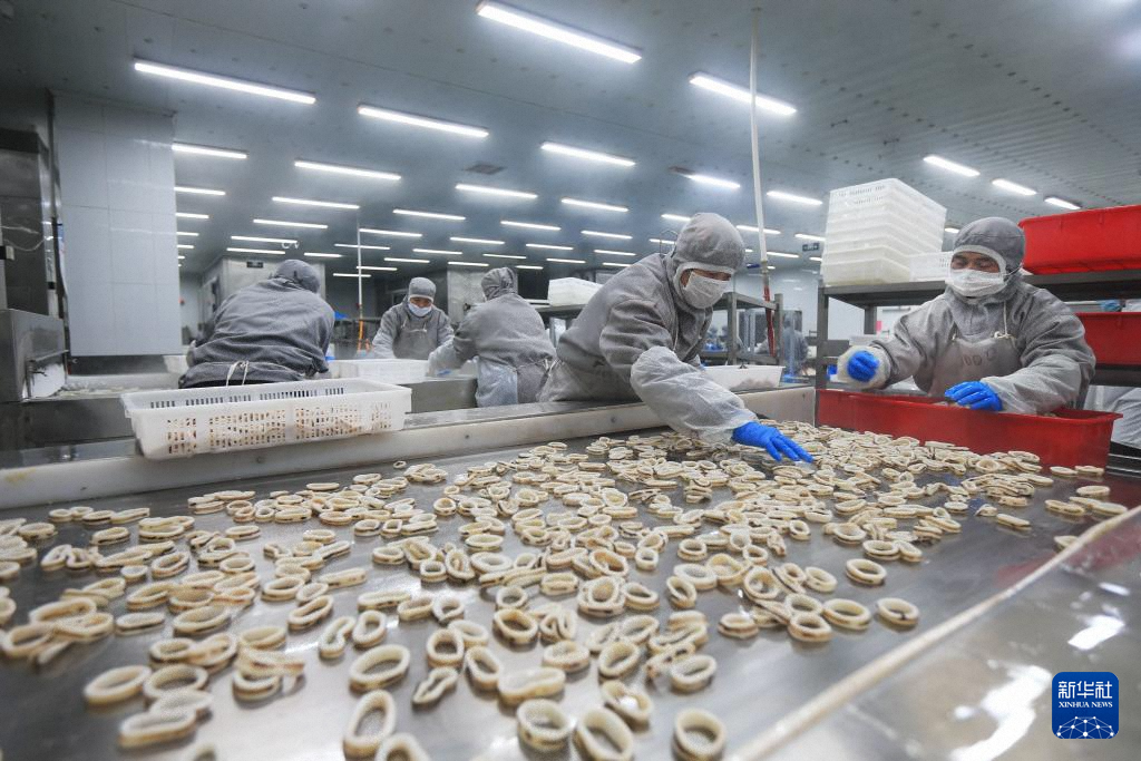 11月10日,山東省榮成市一家海洋食品加工企業(yè)的工人在加工魷魚產品。新華社發(fā)(王福東 攝)