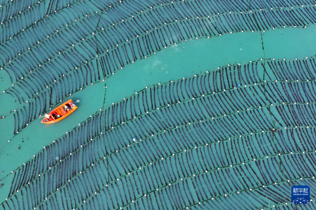 11月10日,在山東省榮成市桑溝灣海洋牧場,養(yǎng)殖工人在養(yǎng)殖區(qū)穿梭作業(yè)(無人機照片)。新華社發(fā)(王福東 攝)