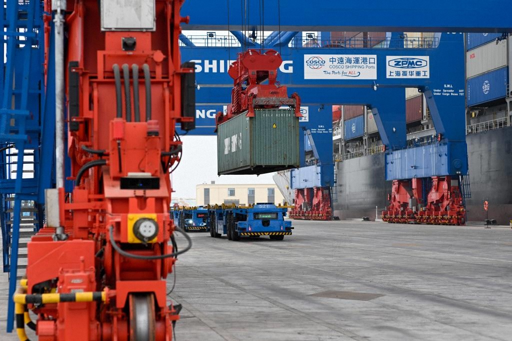 2024年11月14日,在秘魯首都利馬以北的錢(qián)凱港,岸邊智能化設(shè)備吊裝集裝箱。當(dāng)天,中秘共建“一帶一路”重點(diǎn)項(xiàng)目錢(qián)凱港開(kāi)港。新華社記者李夢(mèng)馨攝