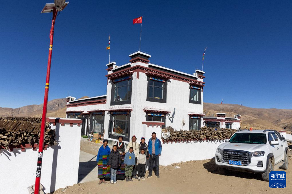 西藏定日縣曲洛鄉(xiāng)熱木青村村民尼瑪平措(右一)一家在新房和自家的汽車前拍照(11月12日攝)。