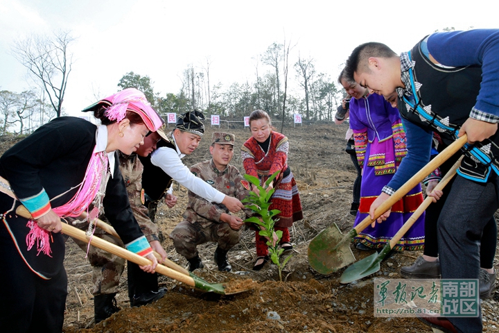 少數(shù)民族群眾與掃雷官兵在已掃雷場栽種果樹。嚴浩 攝
