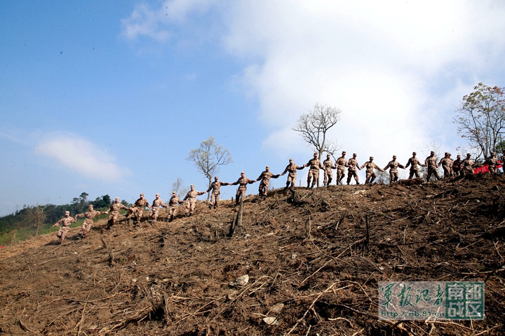 掃雷官兵手牽手徒步驗(yàn)收雷場。嚴(yán)浩 攝