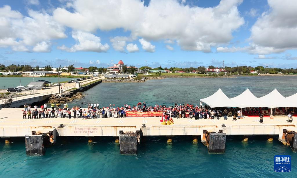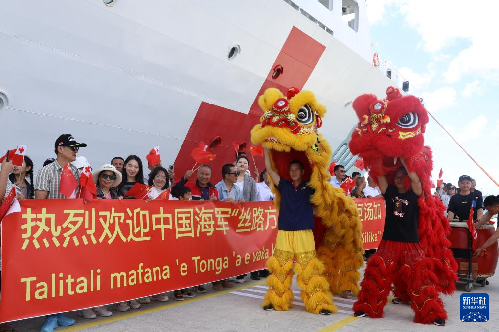 10時(shí)許,在湯加海軍巡邏艇引導(dǎo)下,“絲路方舟”號(hào)醫(yī)院船懸掛中湯兩國(guó)國(guó)旗,緩緩駛抵努庫(kù)阿洛法港。湯加代理首相福希馬洛西及軍政要員、中國(guó)駐湯加大使和當(dāng)?shù)孛癖?、華僑華人及中資機(jī)構(gòu)代表等在碼頭迎接。湯加軍樂(lè)隊(duì)演奏中湯兩國(guó)國(guó)歌,身著傳統(tǒng)服飾的當(dāng)?shù)孛癖娤蛑袊?guó)海軍官兵獻(xiàn)上花環(huán),表演民族舞蹈。