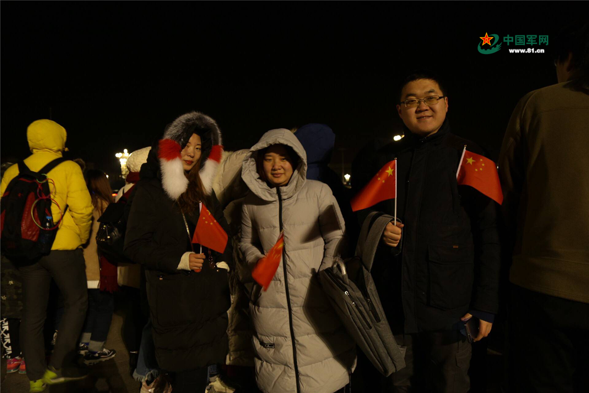 有備而來。為了看升旗,市民張裕浩(右一)特意網(wǎng)購了小紅旗,昨晚就來到了天安門廣場。中國軍網(wǎng)記者周圓 攝