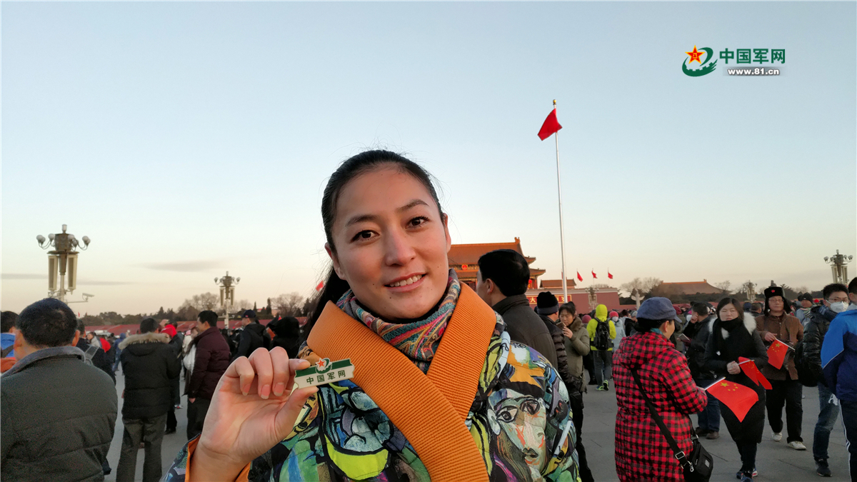 2018年1月1日清晨,北京天安門廣場(chǎng)舉行隆重的升國(guó)旗儀式。來自全國(guó)各地的數(shù)萬名群眾現(xiàn)場(chǎng)觀看升國(guó)旗儀式,迎接2018年的到來。現(xiàn)場(chǎng)觀眾看到中國(guó)軍網(wǎng)記者身上佩戴的胸牌后,紛紛要求和“中國(guó)軍網(wǎng)”胸牌拍照留念,這位觀眾是一位軍嫂。中國(guó)軍網(wǎng)記者孫智英 攝