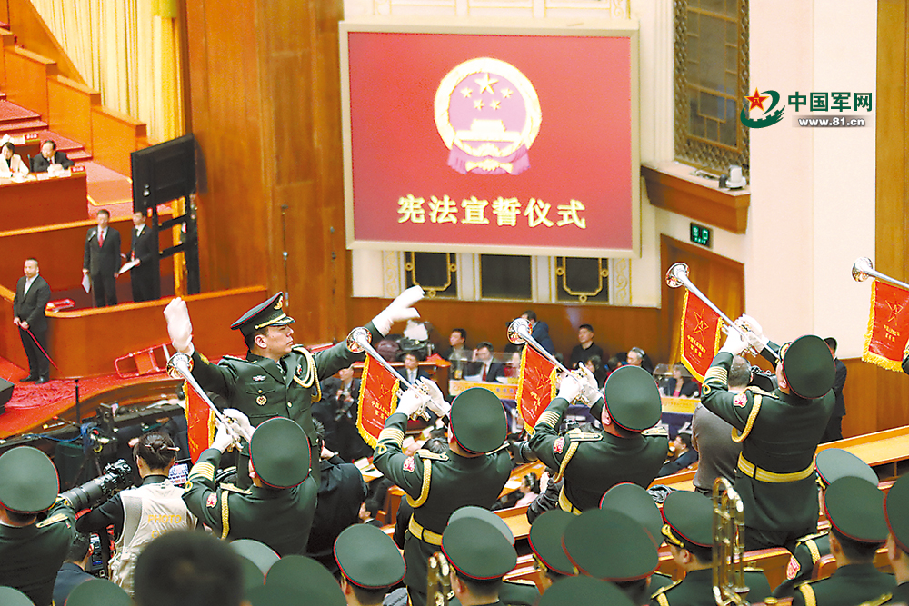 3月18日上午,十三屆全國人大一次會議舉行第六次全體會議。圖為中國人民解放軍軍樂團奏響宣誓儀式曲。