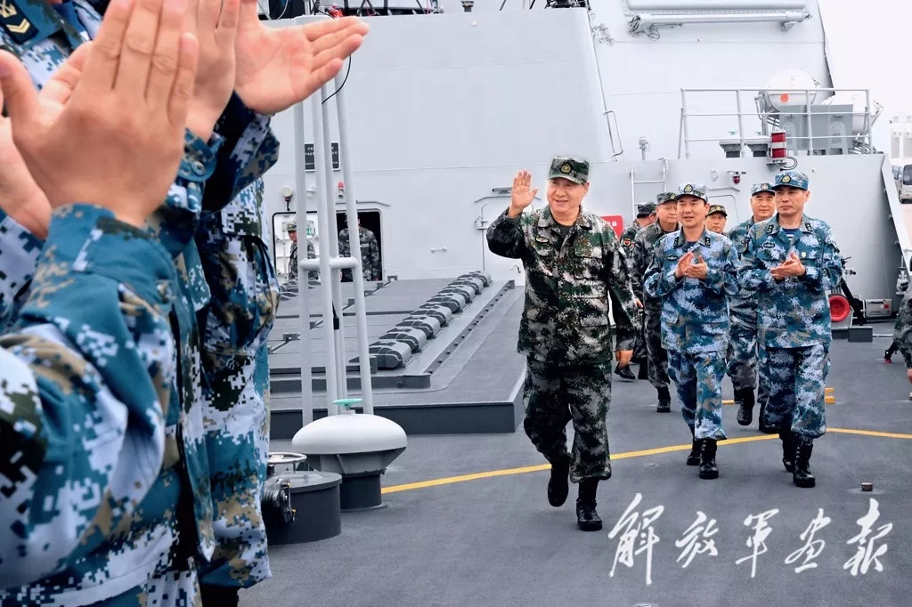檢閱艦停靠碼頭后,習(xí)近平走上前甲板,親切接見(jiàn)長(zhǎng)沙艦官兵。