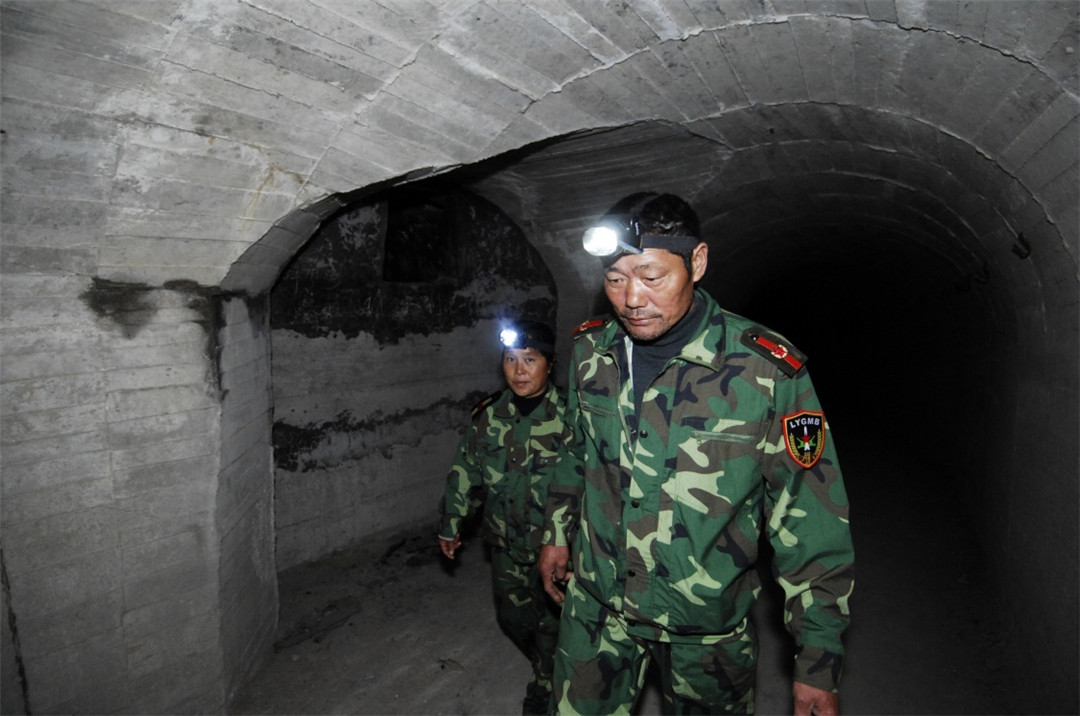 王繼才夫婦夜間在島上山體通道內(nèi)巡邏(2011年11月1日攝)。新華社發(fā)(沈鵬 攝)