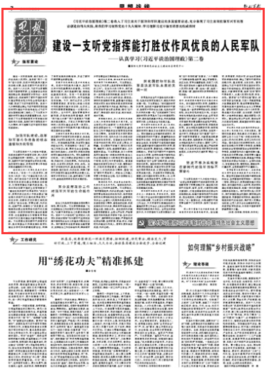 《習(xí)近平談治國(guó)理政》第二卷收入了習(xí)主席關(guān)于國(guó)防和軍隊(duì)建設(shè)的多篇重要論述,充分體現(xiàn)了習(xí)主席領(lǐng)航強(qiáng)軍興軍的理論創(chuàng)造和偉大實(shí)踐,是我們學(xué)習(xí)領(lǐng)悟黨的十九大精神、學(xué)習(xí)理解習(xí)近平強(qiáng)軍思想的權(quán)威教材。建設(shè)一支聽(tīng)黨指揮、能打勝仗、作風(fēng)優(yōu)良的人民軍隊(duì),是實(shí)現(xiàn)“兩個(gè)一百年”奮斗目標(biāo)、實(shí)現(xiàn)中華民族偉大復(fù)興的戰(zhàn)略支撐,是黨在新時(shí)代的強(qiáng)軍目標(biāo)。請(qǐng)關(guān)注今日《解放軍報(bào)》的報(bào)道——