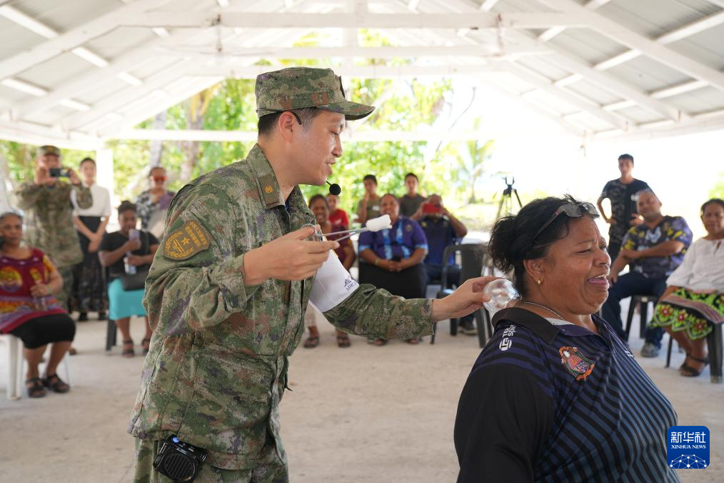 9月23日,中國海軍“絲路方舟”號醫(yī)院船醫(yī)護人員在瑙魯為當?shù)孛癖娭委?。新華社發(fā)(崔曉洋攝)