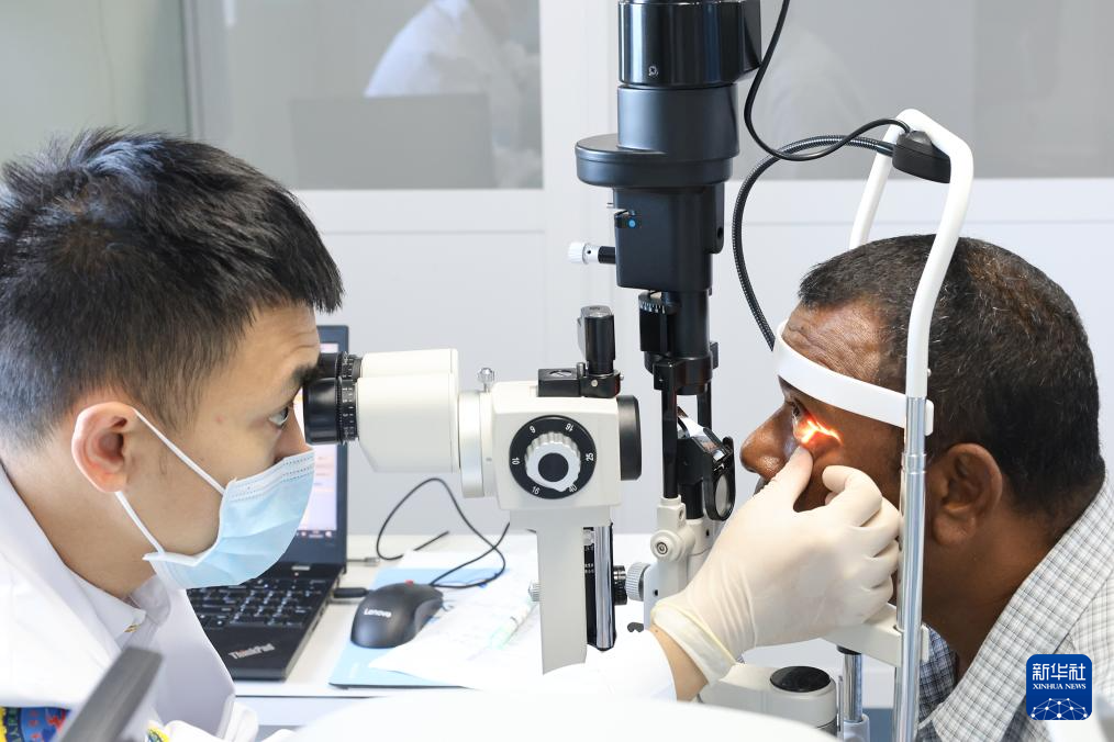 9月23日,中國海軍“絲路方舟”號醫(yī)院船醫(yī)護人員在瑙魯為當?shù)孛癖娺M行眼科檢查。新華社發(fā)(崔曉洋攝)