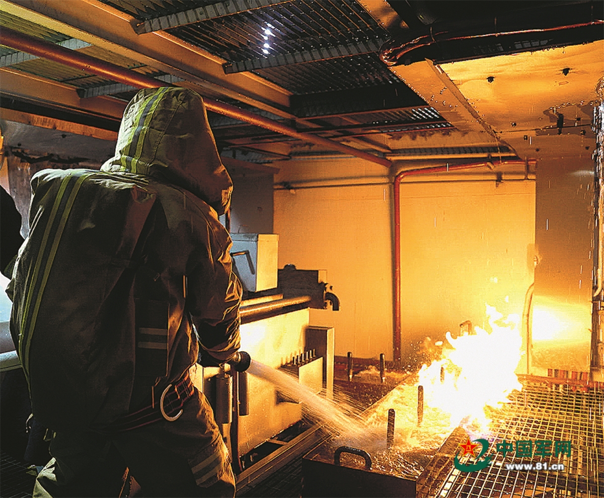 “潛艇遇襲”,模擬艙室突現(xiàn)“火情”。指揮員下達(dá)“封艙滅火”指令,損管隊(duì)員立即穿戴防火服,攜帶滅火器材奔赴“起火”艙室,迅即投入滅火戰(zhàn)斗。
