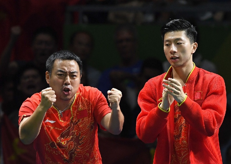8月17日,中國(guó)隊(duì)教練劉國(guó)梁和隊(duì)員馬龍(右)慶祝中國(guó)隊(duì)得分。