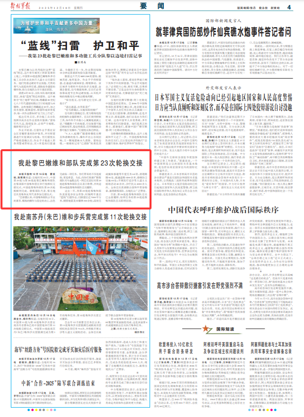解放軍報(bào)貝魯特12月16日電 瞿發(fā)統(tǒng)、張博禹報(bào)道:當(dāng)?shù)貢r(shí)間15日,中國(guó)第23批與第24批赴黎巴嫩維和部隊(duì)在黎南部中國(guó)維和營(yíng)區(qū)舉行指揮權(quán)交接儀式,中國(guó)赴黎維和部隊(duì)第23次輪換順利完成。聯(lián)黎部隊(duì)代表、黎當(dāng)?shù)毓賳T及維和友軍代表參加交接儀式。