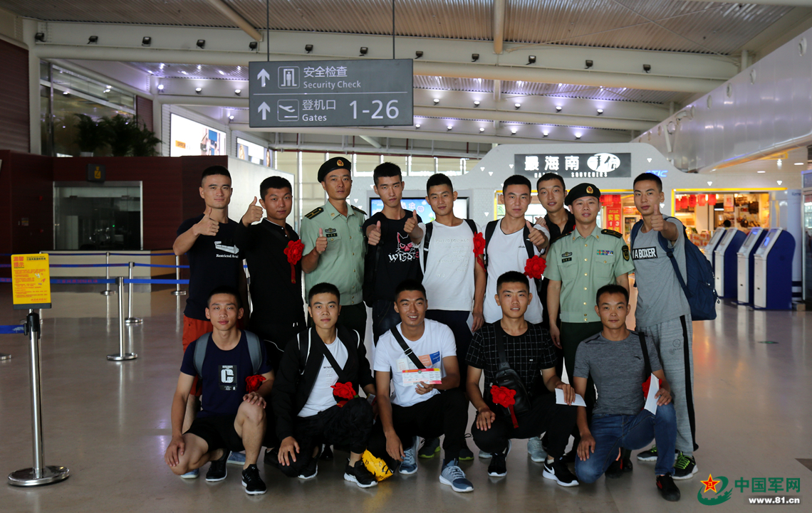 2017年9月1日,武警三亞支隊(duì)部分退伍老兵在三亞鳳凰國(guó)際機(jī)場(chǎng)合影。支隊(duì)根據(jù)退伍義務(wù)兵的意愿,首次采用航空手段輸送退伍老兵返鄉(xiāng)。