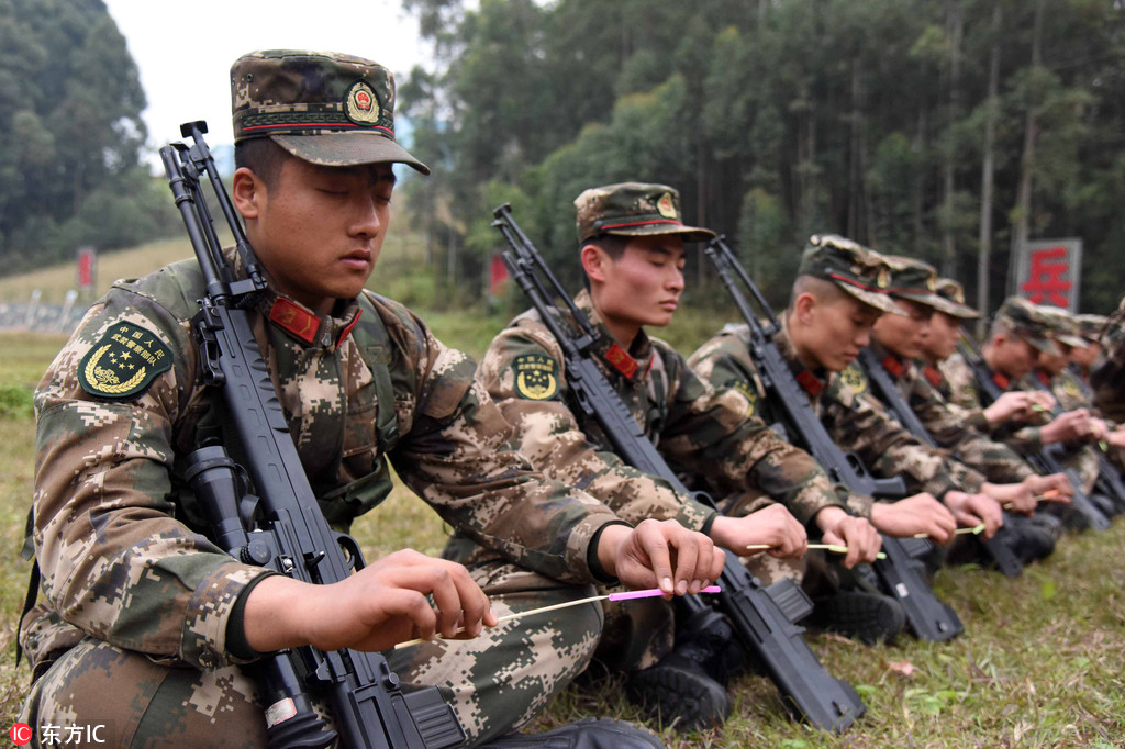 2018年2月8日,狙擊手正在閉眼將竹簽插入吸管,以此訓(xùn)練射擊時的穩(wěn)定性。