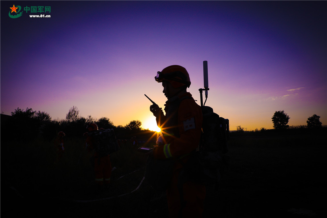夜幕降臨,一名通信兵仍在傳輸火場信息