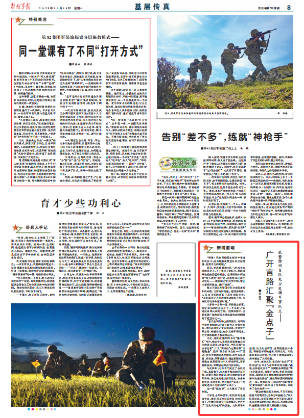 “官兵在訓(xùn)練場(chǎng)上摸爬滾打,對(duì)訓(xùn)練中存在的問(wèn)題,對(duì)自身能力還有哪些短板,他們最清楚?!敝ш?duì)領(lǐng)導(dǎo)說(shuō),關(guān)鍵要廣開(kāi)言路,暢通渠道,充分發(fā)揚(yáng)軍事民主,把大家的聰明才智凝聚起來(lái)。