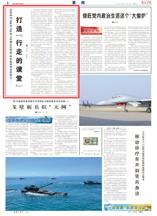 “紅色資源是新時(shí)代思想政治教育的寶貴財(cái)富?!痹撝ш?duì)領(lǐng)導(dǎo)介紹,巴蜀大地紅色資源豐富,革命歷史厚重,擁有紅軍強(qiáng)渡嘉陵江戰(zhàn)役遺址、川陜革命根據(jù)地紅軍烈士陵園等著名紅色遺址、革命舊址。他們以“紅色故事、紅色打卡、紅色創(chuàng)演”為牽引,充分挖掘駐地紅色資源,按照“體系設(shè)計(jì)、系統(tǒng)整合、深化運(yùn)用、分步實(shí)施”的思路,積極構(gòu)建富有地域特色的“行走的課堂”紅色文化教育矩陣,讓官兵時(shí)時(shí)受教育、處處受感染。