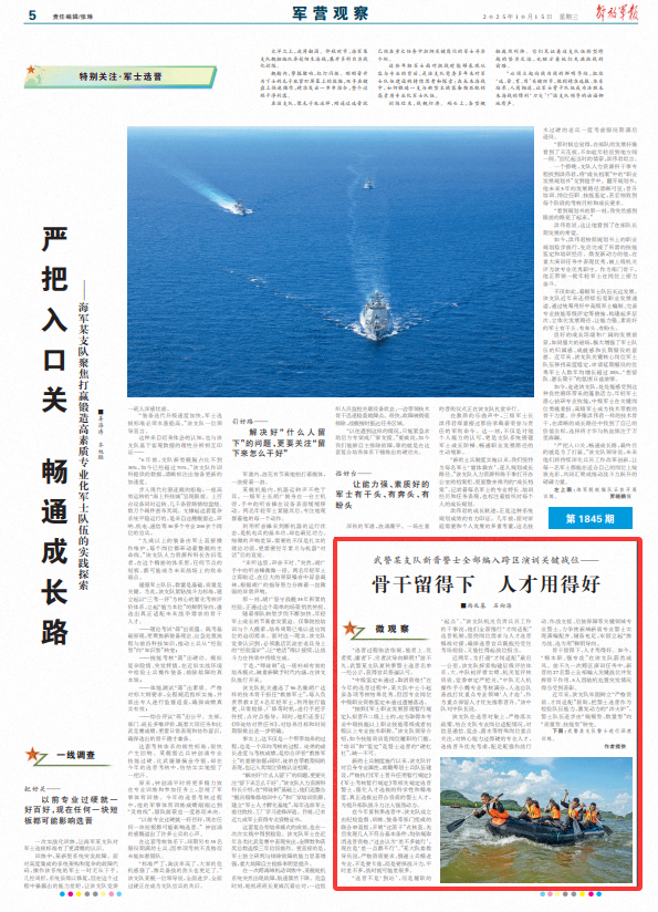 在今年夏秋季選晉中,該支隊成立由紀檢監(jiān)察、訓練、裝備等部門組成的聯(lián)合審查組,開展“過篩子”式核查,先后發(fā)現(xiàn)幾人不符合基本條件,均依規(guī)取消選晉資格。“過去認為‘差不多就行’,現(xiàn)在是‘差一點都不行’?!蹦炒箨牻虒T說,嚴格資質(zhì)要求,倒逼士兵精進專業(yè),不是要卡誰,而是要保戰(zhàn)斗力,平時差不多,戰(zhàn)時就可能差很多。