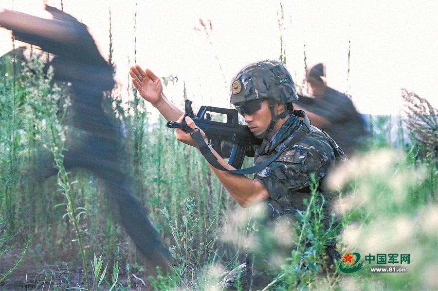 武警第二機(jī)動(dòng)總隊(duì)組織戰(zhàn)斗檢驗(yàn)。圖為某中隊(duì)?wèi)?zhàn)術(shù)小組正在進(jìn)行追擊行動(dòng)。