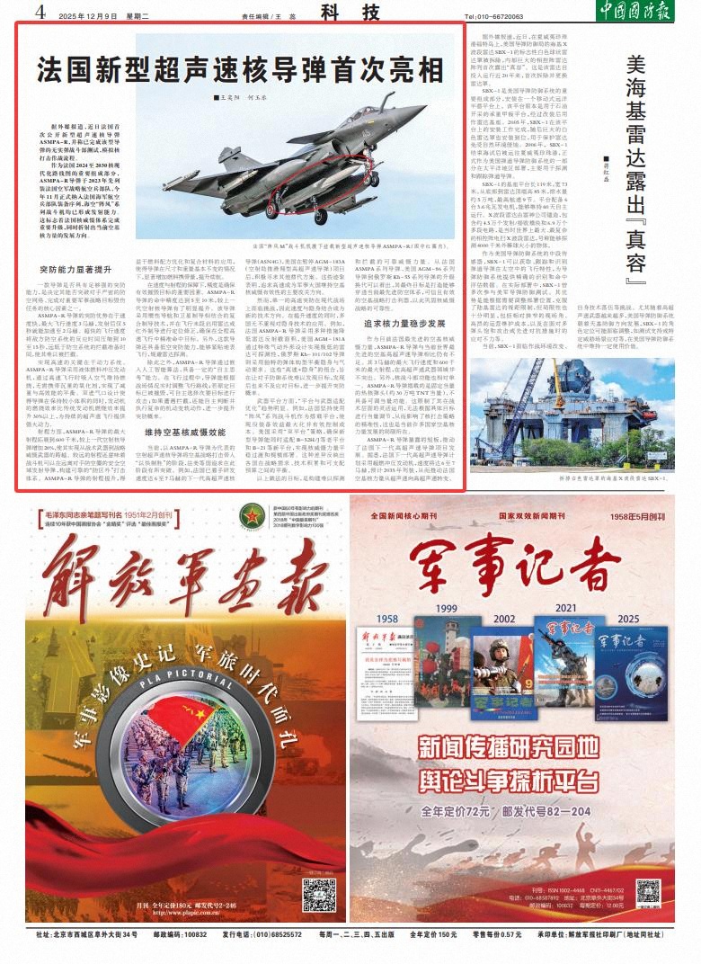 作為法國(guó)2024至2030核現(xiàn)代化路線圖的重要組成部分,ASMPA-R導(dǎo)彈于2023年先列裝法國(guó)空軍戰(zhàn)略航空兵部隊(duì),今年11月正式納入法國(guó)海軍航空兵部隊(duì)裝備序列,??铡瓣囷L(fēng)”系列戰(zhàn)斗機(jī)均已形成發(fā)射能力。這標(biāo)志著法國(guó)核威懾體系完成重要升級(jí),同時(shí)折射出當(dāng)前空基核力量的發(fā)展方向。